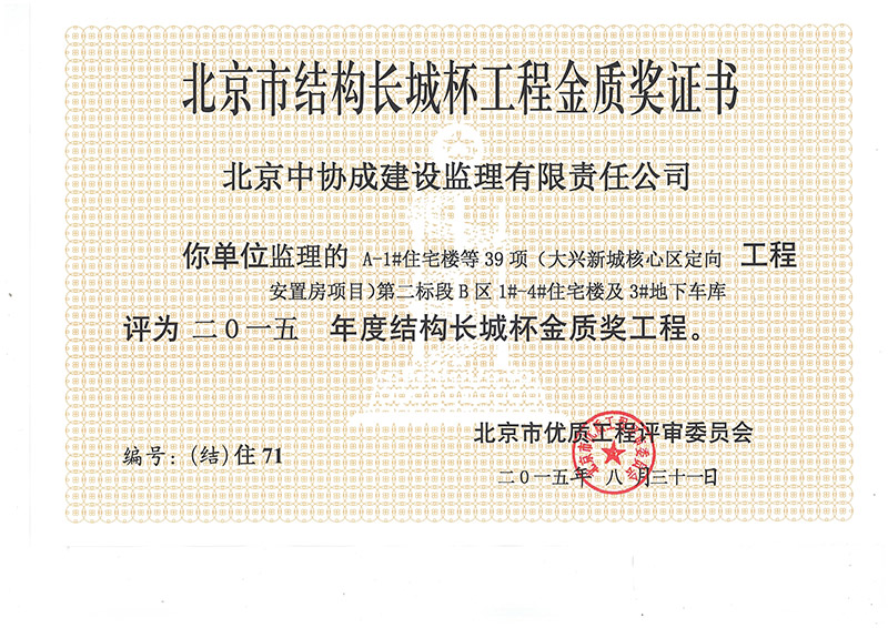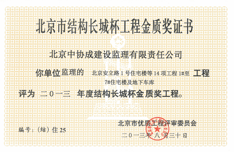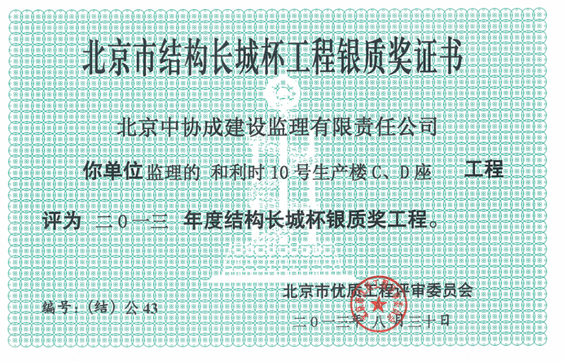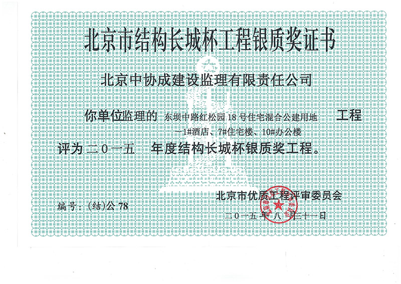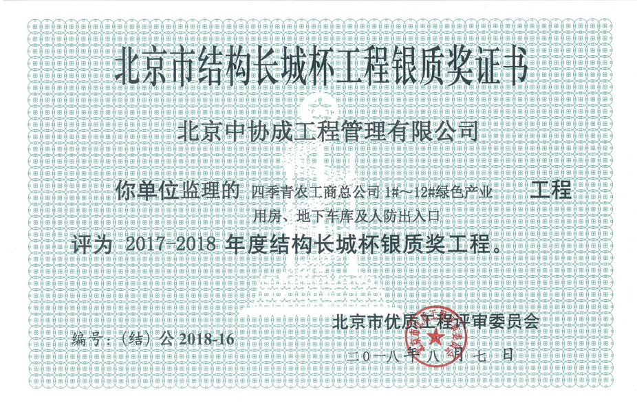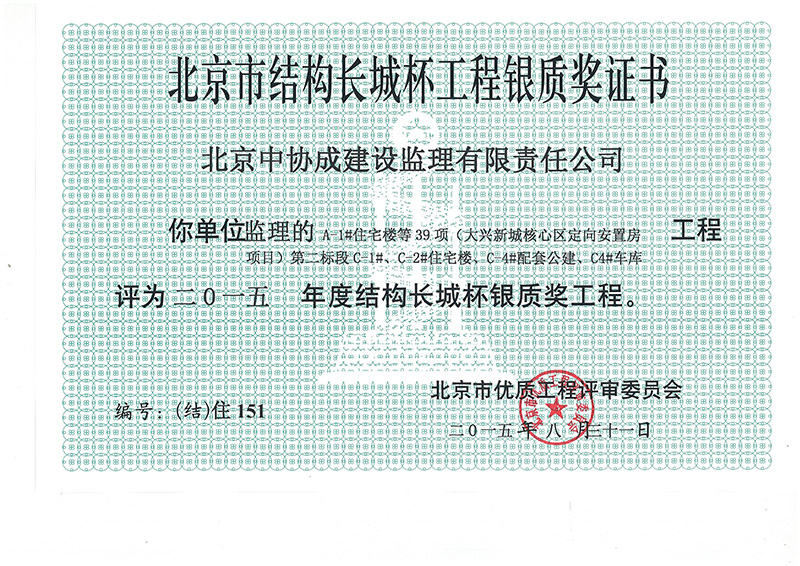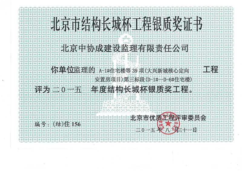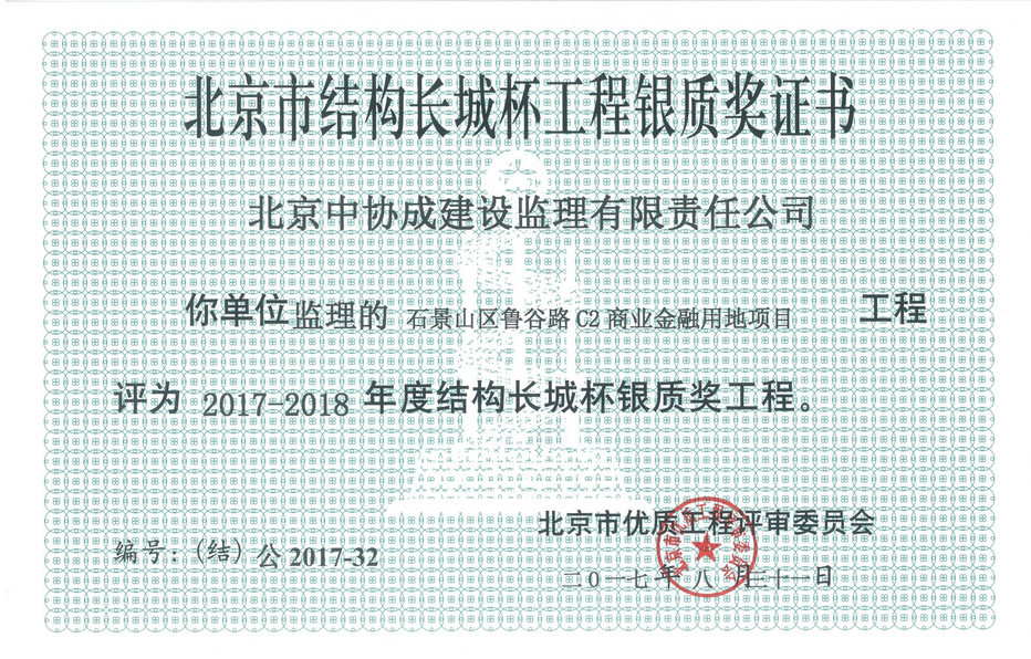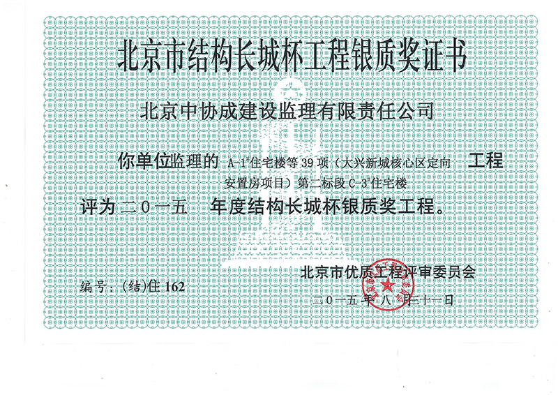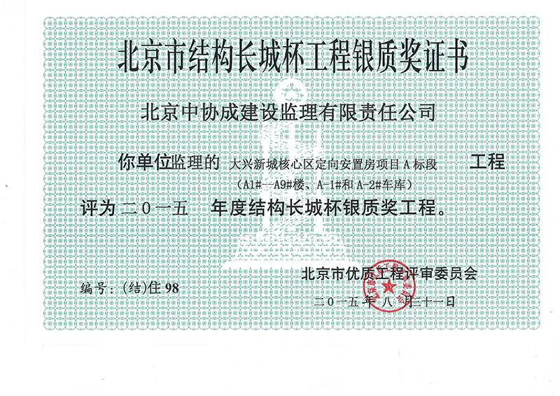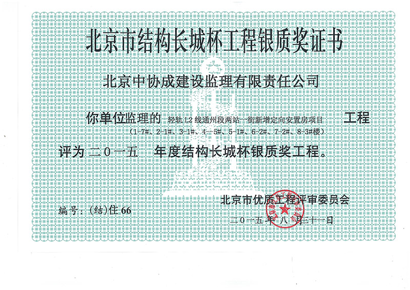 北京市結(jié)構(gòu)長城杯工程銀質(zhì)獎證書