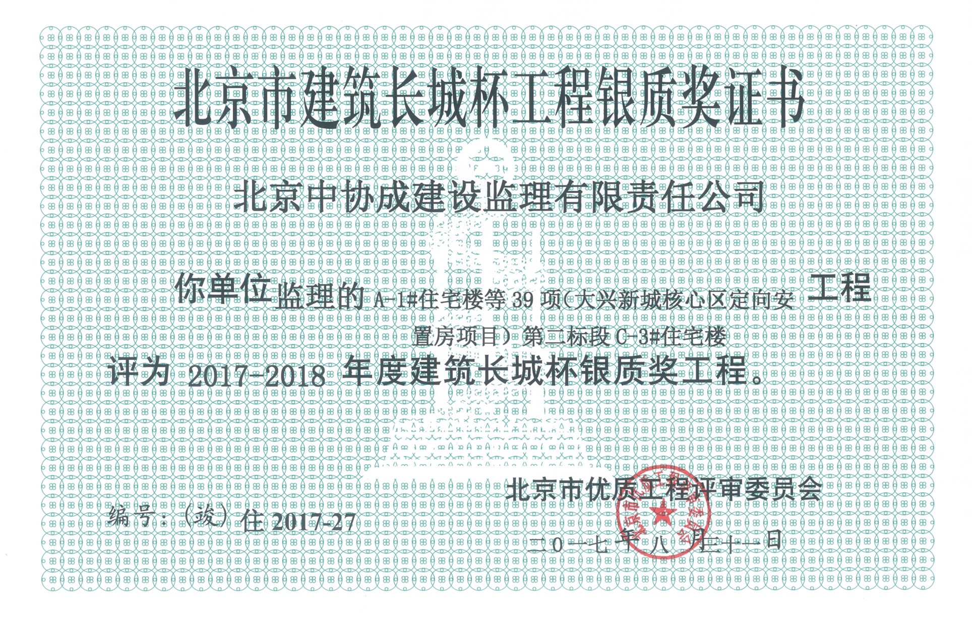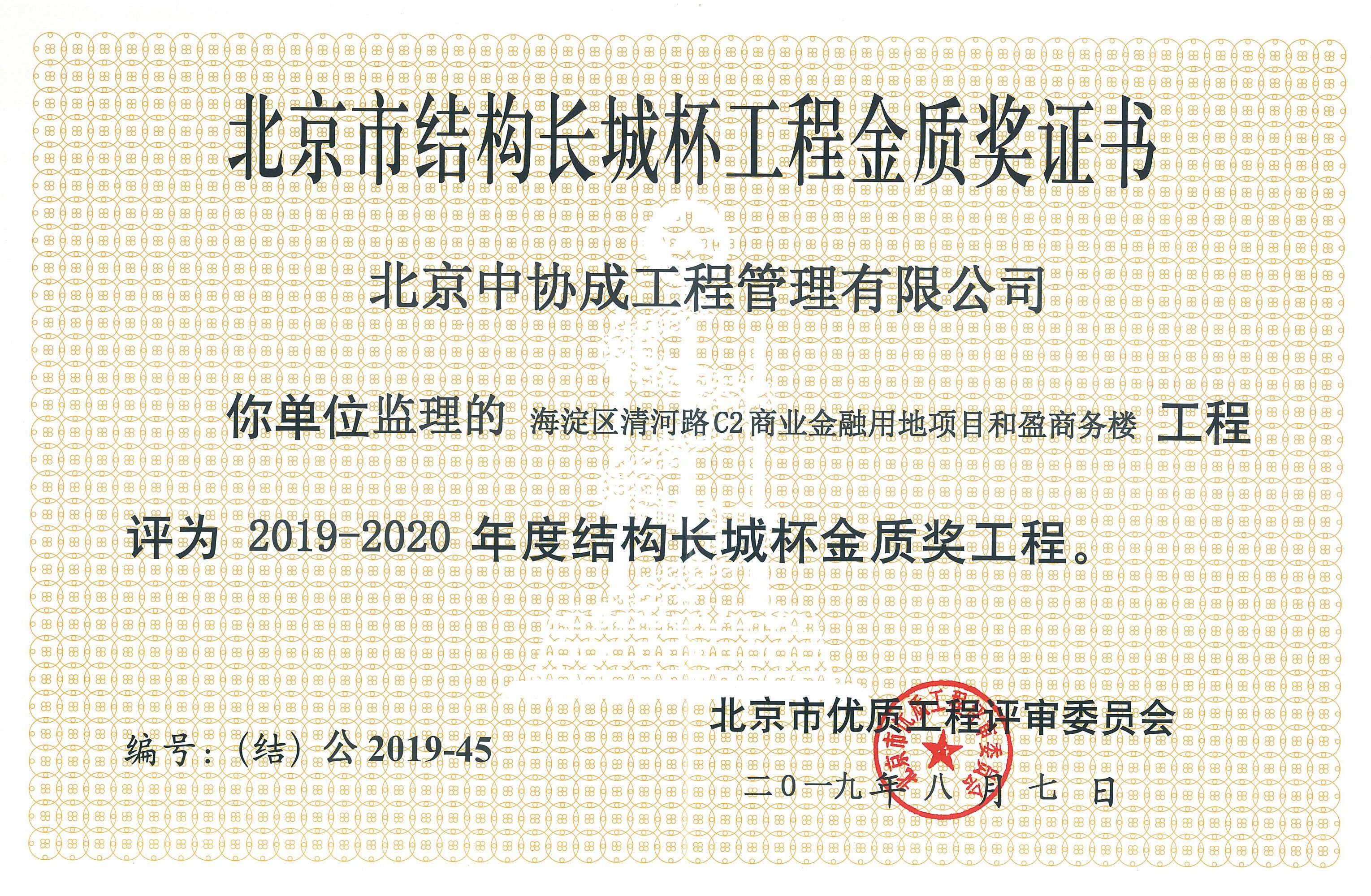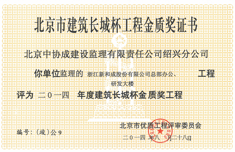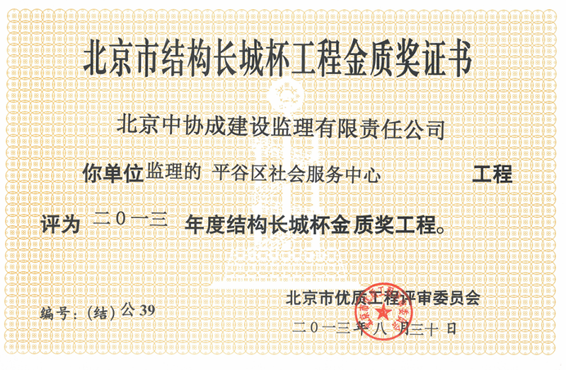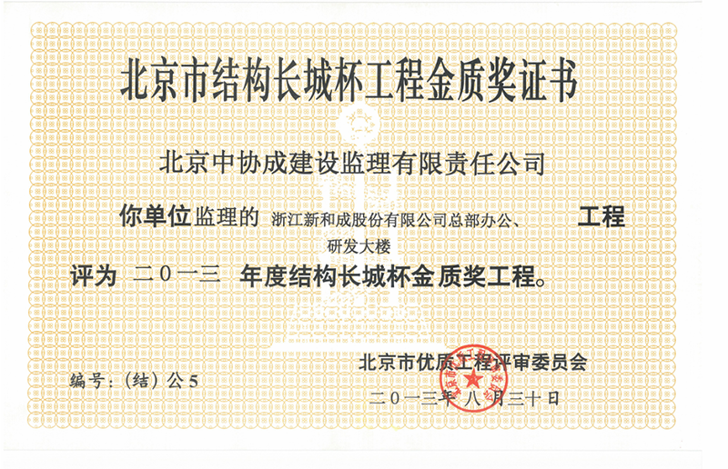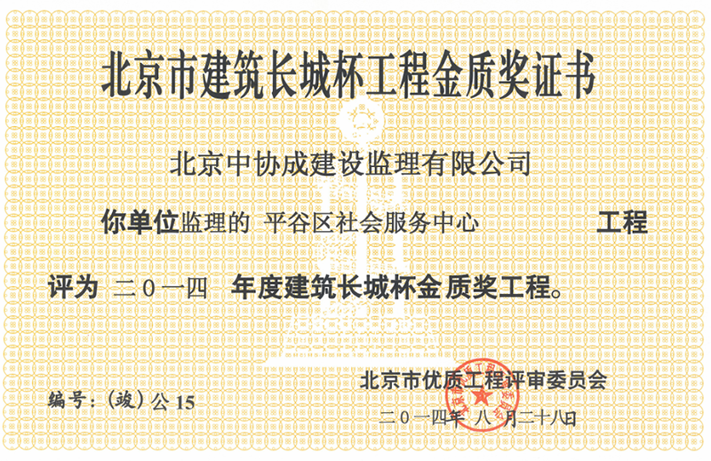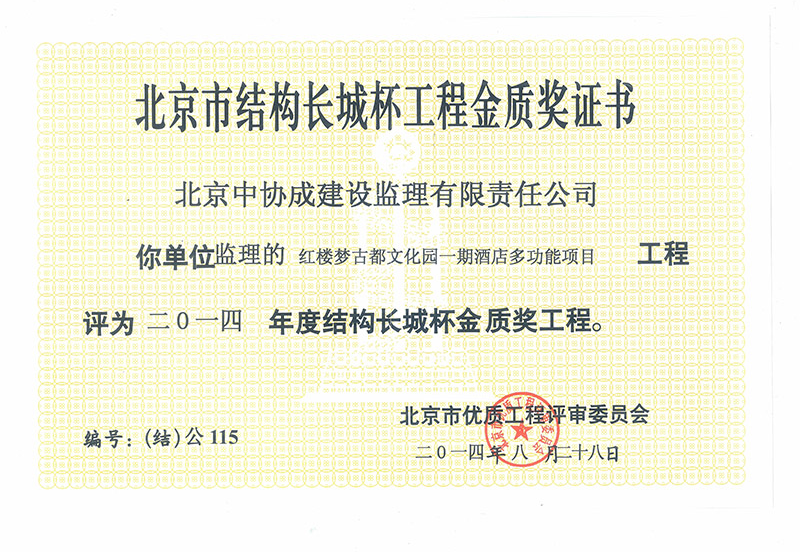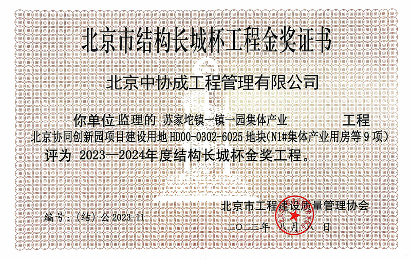 北京市結(jié)構(gòu)長城杯工程銀質(zhì)獎證書