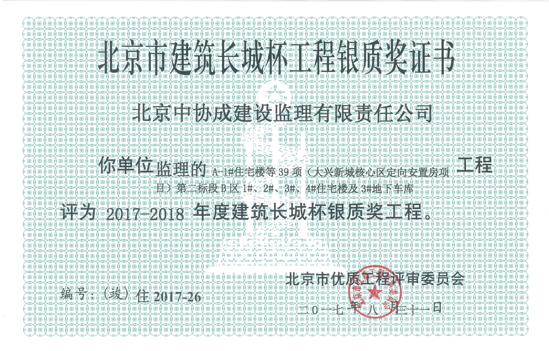 2017-2018大興安置房第二標段B區1#、2#、3#、4#住宅樓及3#地下車庫建筑長城杯銀質獎