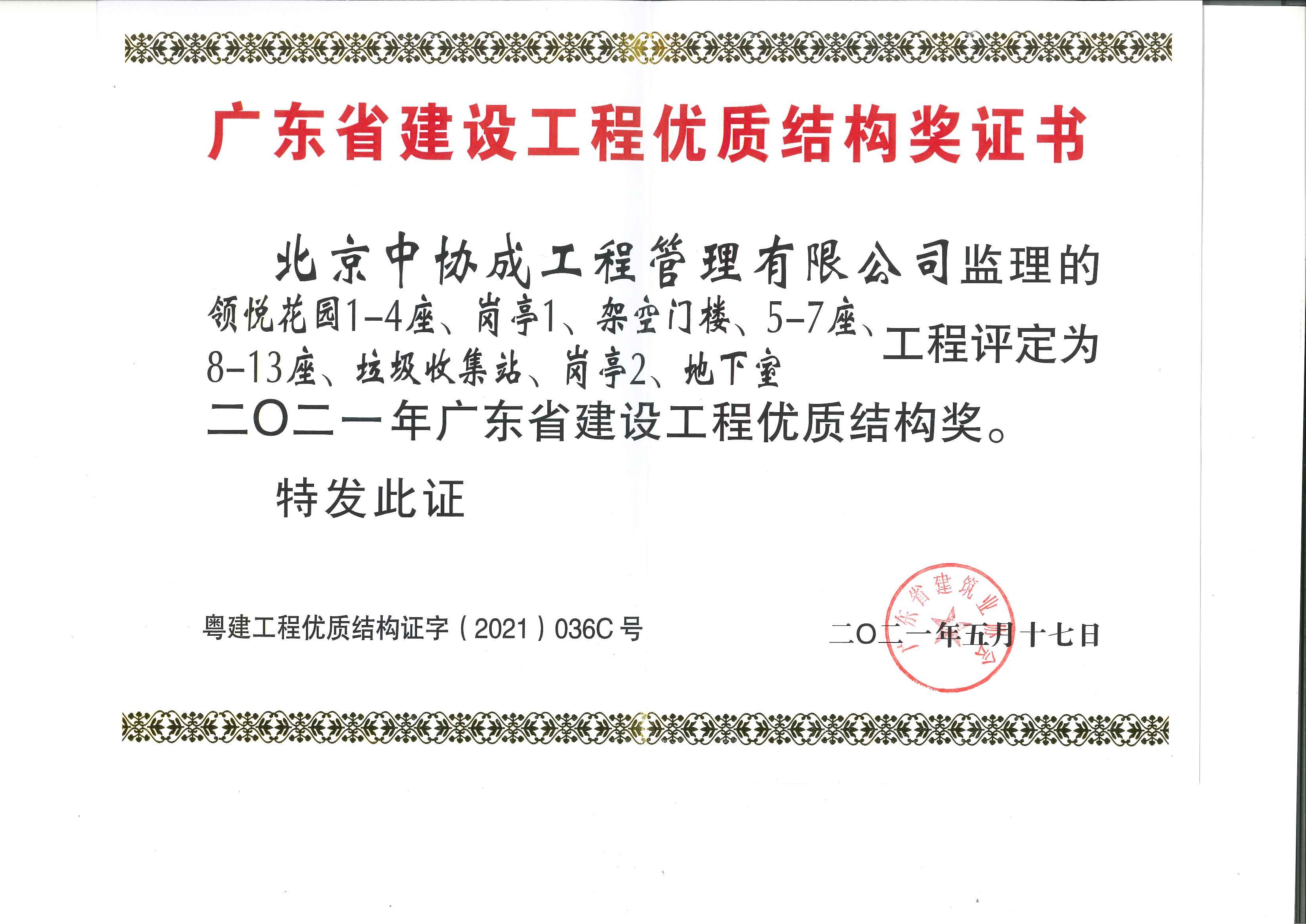 領悅花園1-4座等工程2021年廣東省建設工程優質結構獎