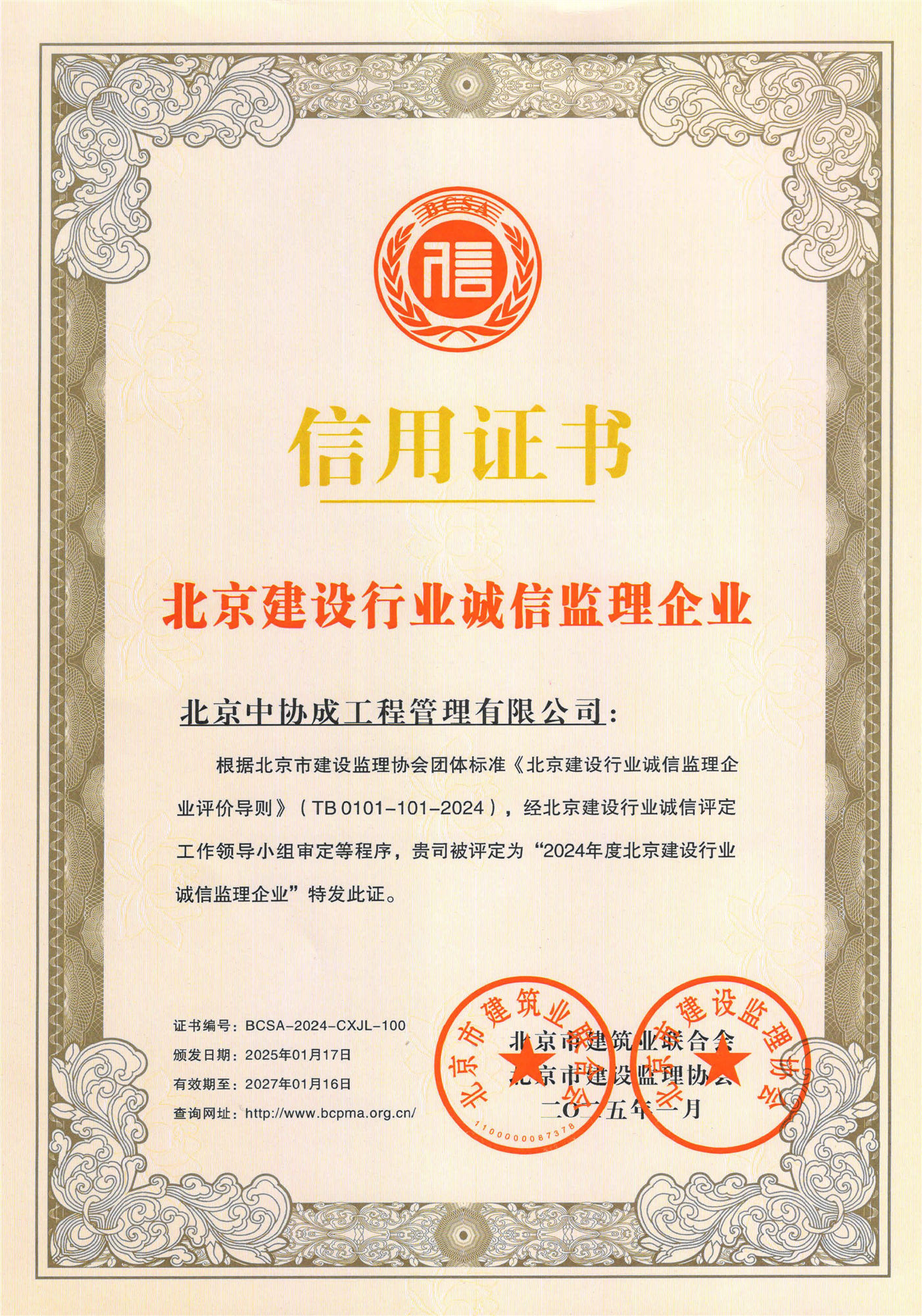 2024年度北京建設(shè)行業(yè)誠信監(jiān)理企業(yè)證書